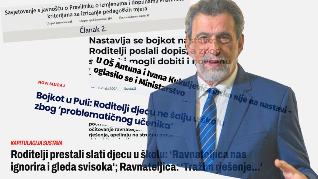 “Roditelji imaju pravo izražavati nezadovoljstvo, protestirati i slično, ali nemaju pravo priječiti djeci da idu na nastavu i na takav način ih koristiti kao sredstvo pritiska”, objasnio je 8. siječnja ministar znanosti, obrazovanja i mladih Radovan Fuchs, najavljujući izmjene Pravilnika o kriterijima za izricanje pedagoških mjera. Novi pravilnik, koji će se u sustavu e-Savjetovanja nalaziti do 7. veljače, u jednom svojem dijelu nastoji Fuchsovu dubioznu etičku tvrdnju pretočiti u zakonodavni okvir. U njegovu čl. 2. propisuje da se izostanak učenika s nastave zbog izražavanja nezadovoljstva i protesta učenika ili roditelja ne može opravdati, te školama u kojima “roditelji iz različitih razloga ne dopuštaju djetetu odlazak u školu” nalaže obavještavanje nadležnog područnog ureda Hrvatskog zavoda za socijalni rad. U prijevodu, ako roditelji odluče djecu ne slati u škole jer su obrazovni uvjeti nesigurni ili neadekvatni, škola je dužna pozvati im socijalnu skrb.