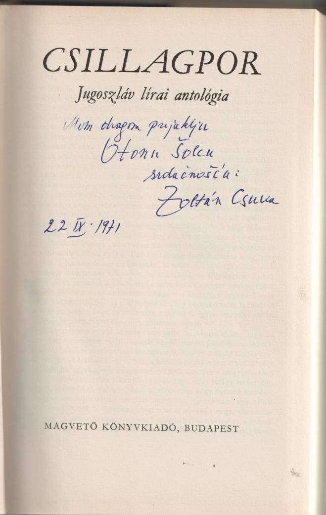 Godine 1971. u Budimpešti je objavljena lijepo opremljena antologija jugoslavenske poezije CSILLAGPOR avangardnog mađarskog pisca Zoltána Csukae, u kojoj je zastupljen i Krleža s tri pjesme. I ovdje počinje moj problem. Držim u ruci primjerak knjige s posvetom „Mom dragom prijatelju Otonu Šolcu srdačnošću: Zoltán Csuka , 22.09.1971.“, pa pokušavam provjeriti prisutnost ove antologije u knjižnicama NSK i Gradskoj knjižnici Zagreb. Rezultat u koji nekako ne vjerujem je 0. Bilo bi mi draže da sam ja u nečemu pogriješio.
