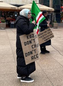 Na akciji je bilo prisutno četvero organizatora i organizatorica i svega par vanjskih ljudi, a glavnu riječ vodila je Roza Dunajeva, Čečenka i aktivistkinja za ljudska prava koja djeluje u Austriji. Dunajeva je istaknula nepravdu s kojom se njen narod nakon dva rata, mučenja i progona susreće u Europi u kojoj je još uvijek prisiljen tražiti sigurnost, a umjesto razumijevanja, tamo nailazi na ponižavanje, deportacije i uskraćivanje prava na sigurnost. Pozivala je na prekid odnosa s Rusijom, sjećanje na žrtve i slobodu svim okupiranim narodima počevši od Čečenije i Ukrajine. Okupljeni su uzvikivali parolu „Rusija je teroristička zemlja“.