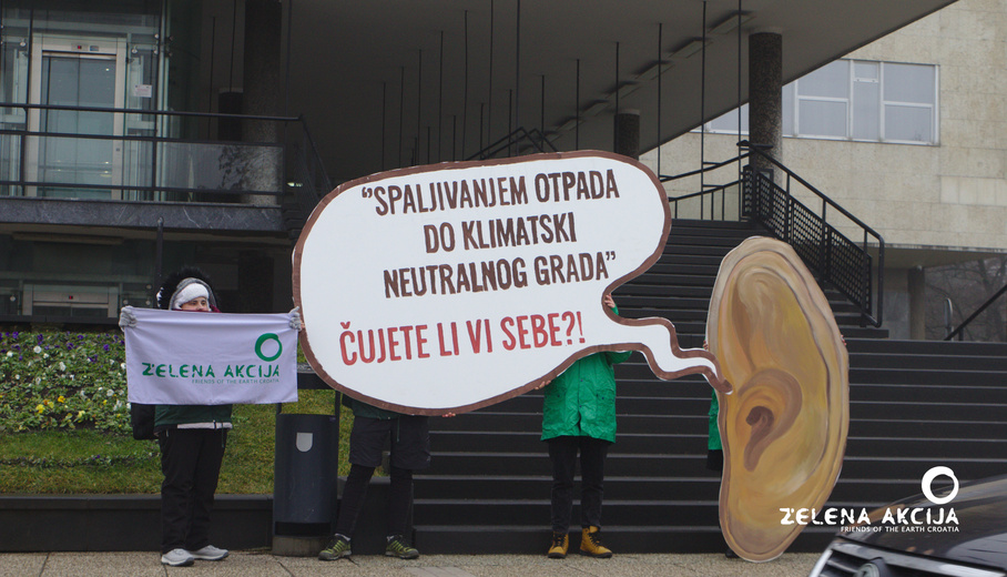 „Izuzetno smo zabrinuti što je dokazano štetno spaljivanje okosnica novog Plana gospodarenja otpadom. Zbog toga smo uz primjedbe na Plan gradonačelniku donijeli i divovsko uho kako bi jasnije čuo da postoje bolja rješenja”, poručio je Marko Košak iz Zelene akcije i dodao: „Krajnje je vrijeme da se prestanu ignorirati građani i da se odaberu rješenja kojima se otpad maksimalno smanjuje i iskorištava u industriji, umjesto da se pretvara u štetne plinove i toksičan pepeo!” Aktivisti i aktivistkinje Zelene Akcije jučer su zbog Plana koji uključuje spaljivanje otpada prosvjedovali ispred Gradskog poglavarstva.