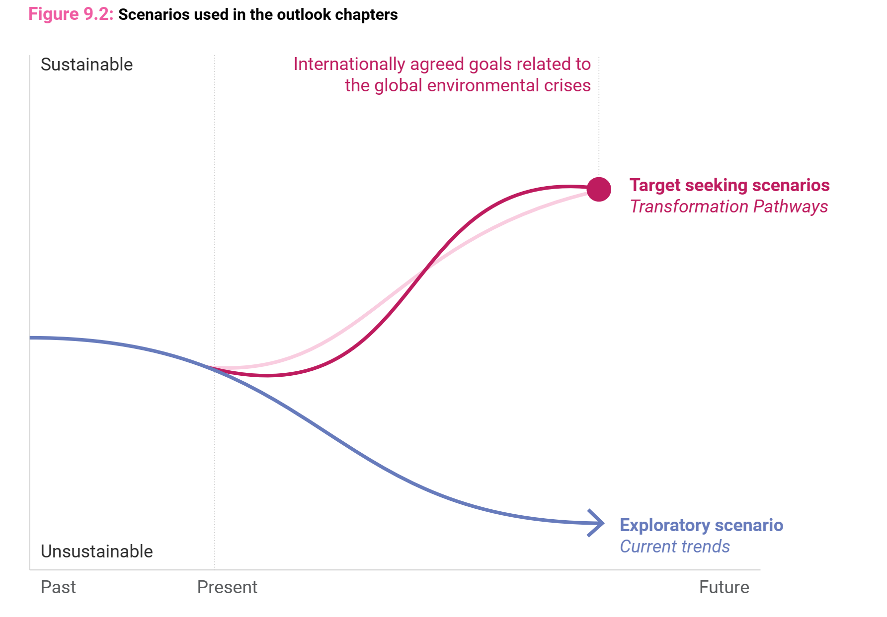 Scenarij trenutačnih trendova opisuje kako se pet sustava (gospodarstvo i financije, hrana, energija, materijali i otpad te okoliš) razvijaju uz nastavak postojećih trendova i napora te omogućuje procjenu okolišnih i socioekonomskih posljedica u izostanku strožih politika za rješavanje globalnih okolišnih kriza. U suprotnosti s njim dva transformacijska scenarija opisuju alternativne pravce razvoja s postizanjem zadatih ciljeva održivog razvoja, a koji kombiniraju različita rješenja unutar pet sustava.
