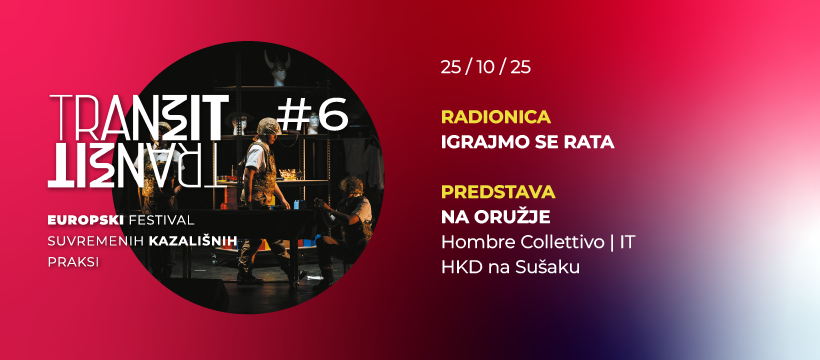 Festival suvremenih kazališnih praksi TranziT #6 ovoga vikenda predstavlja talijansku kazališnu skupinu Hombre Collettivo sa vizualno snažnom predstavom „Na oružje / Alle Armi” te popratnu radionicu za publiku „Igrajmo se rata”. Oba programa održavaju se u subotu, 25. listopada u HKD-u na Sušaku. Nemojte propustiti ovo impresivno audio-vizualno kazalište i kazalište objekta.
