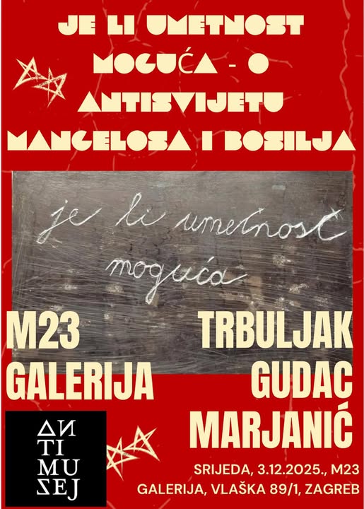 Antimuzej i M23 Galerija pozivaju na predstavljanje i najavnu izložbu “Je li umetnost moguća” – o Antisvijetu Mangelosa i Bosilja u srijedu, 3.12.2025. u 19 sati u M23 Galeriji (Vlaška 89/1, Zagreb).