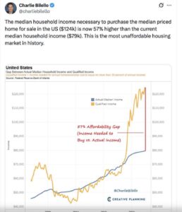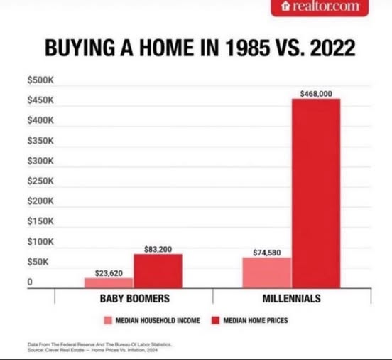 Niti si današnji mladi mogu više kupiti kuću, taj kvintesencijalni korak prema američkom snu. Od 1985.-2022. median prihodi su porasli <4x, a median cijena kuća skoro 7x, tako da je danas median prihod tek 57 posto od onoga koliko banke zahtijevaju da bi dale zajam za kupnju kuće. Nekretnine još jedino mogu kupiti starci, s ušteđevinom iz boljih vremena. Median godište kupca kuće danas je 61 godinu. I samo 21 posto nekretnina kupuju kupci kojima je to prva nekretnina.