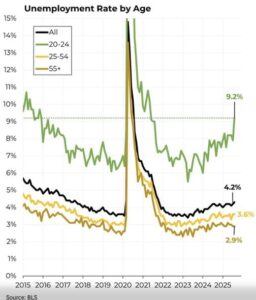 Danas su 70-godišnjaci 72 posto bogatiji nego pred 40 godina, dok su mlađi od 40 – 24 posto siromašniji. I sve im je teže naći posao. Zaposlenost mladih pada neprestano od 1948. Stopa nezaposlenosti među mlađima od 25 je više nego dvostruko viša od stope u bilo kojoj drugoj dobnoj skupini. Desetljećima je zaposlenost slijedila vrijednost S&P 500. U zadnjih pet godina, te dvije krivulje su se potpuno razišle: S&P 500 je nastavio vrtoglavo rasti, a zaposlenost je počela strmoglavo padati. Danas više ljudi zarađuje od obrtanja kapitala nego od vlastitog rada.