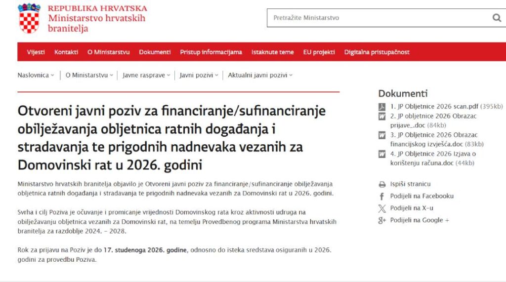 Sredinom prošloga tjedna javnost je bila obaviještena o raspisivanju poziva Ministarstva branitelja veteranskim udrugama koje u 2026. godini namjeravaju obilježavati „obljetnice ratnih događanja i stradavanja“ i „prigodne nadnevke vezane za Domovinski rat“, da se jave radi financiranja ili sufinanciranja takvih aktivnosti.