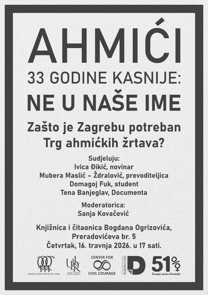 U 17 sati u Knjižnici i čitaonici Bogdana Ogrizovića u Zagrebu bit će održana tribina pod nazivom Ahmići 33 godine kasnije: Ne u naše ime. Na tribini će govoriti Ivica Đikić, novinar, Mubera Maslić – Ždralović, aktivistkinja, prevoditeljica za arapski, Domagoj Fuk, student politologije, član Studentskog zbora Sveučilišta u Zagrebu, Tena Banjeglav, Documenta – Centar za suočavanje s prošlošću. Moderatorica će biti aktivistkinja i novinarka Sanja Kovačević.