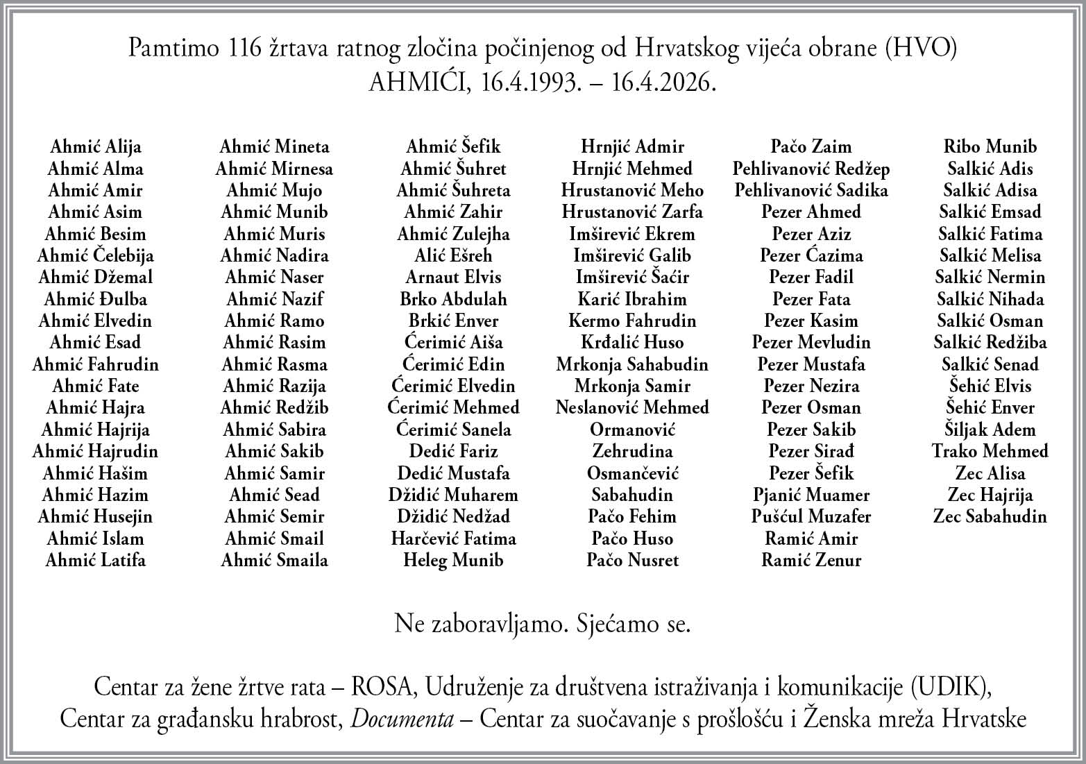 Udruge podsjećaju da su 16. travnja 1993. u ranim jutarnjim satima lokalne postrojbe HVO-a izvele napad na srednjobosansko mjesto Ahmići, pod kodnim imenom „48 sati pepela i dima“. Haški sud je ove zločine okarakterizirao zločinom protiv čovječnosti. Jedan je to od najokrutnijih zločina u ratovima na teritoriju nekadašnje Jugoslavije. Ujedno, to je i najveći pojedinačni zločin počinjen za bošnjačko-hrvatskog sukoba u Bosni i Hercegovini. Ubijeno je 116 osoba bošnjačkog etniciteta, 24 ih je ranjeno, uništeno je 169 kuća te dvije džamije. 32 ubijene žrtve bile su žene, a 11 djeca mlađa od 18 godina. Među ubijenima bile su cijele obitelji. Tijela svih nestalih još uvijek nisu pronađena.