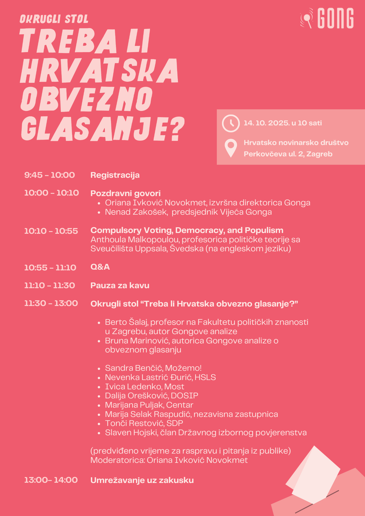 Povod današnjoj raspravi na okruglom stolu “Treba li Hrvatska obavezno glasanje”, bila je Gongova studija autora profesora Berta Šalaja, Brune Marinović i Josipe Brajković Dike, koji su analizirali prednosti i nedostatke uvođenja izborne obaveze građanima, kao i iskustva država u kojima je ova praksa u nekom trenutku bila ili još uvijek je institucionalizirana.