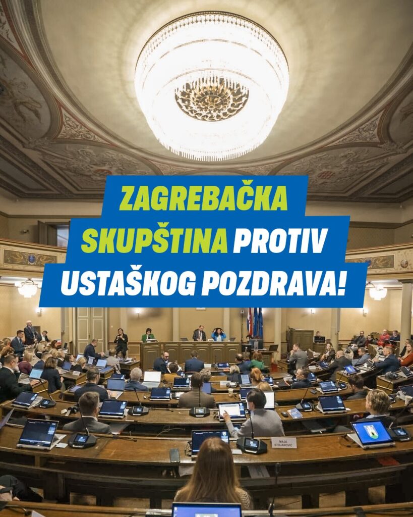 Gradska skupština Grada Zagreba izglasala je jučer Zaključak kojim gradonačelnika poziva da poduzme sve potrebne mjere kako bi se osiguralo da se na javnim površinama i u prostorima kojima upravljaju ustanove i trgovačka društva u vlasništvu Grada, kao i na svim javnim površinama za čije korištenje Grad izdaje dozvolu u svrhu organizacije javnih događaja, ne smiju koristiti obilježja, slogani i poruke kojima se veliča, potiče ili odobrava nacionalna, rasna ili vjerska mržnja, uključujući fašističke i ustaške simbole ili pokliče, uključujući “Za dom spremni”, priopćeno je iz Možemo.