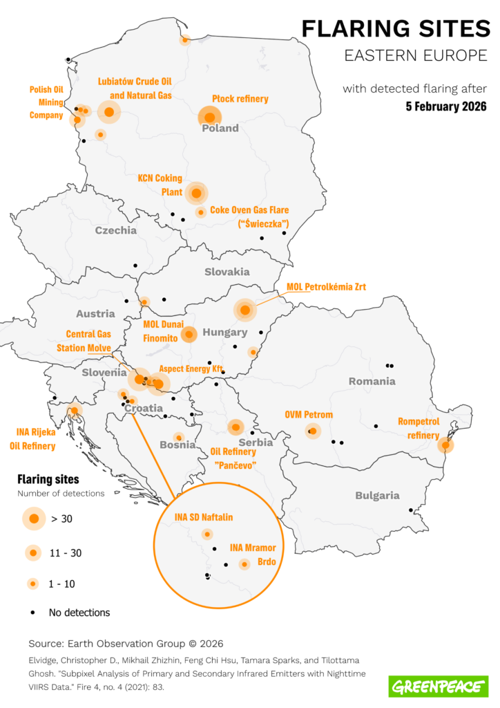 Istraživanje Greenpeacea Hrvatske i Greenpeacea Mađarske otkriva da pojedina postrojenja za fosilni plin i naftu spaljuju velike količine metana čime izgledno krše Uredbu EU-a o metanu koja zabranjuje rutinsko spaljivanje na baklji od 5. veljače 2026.