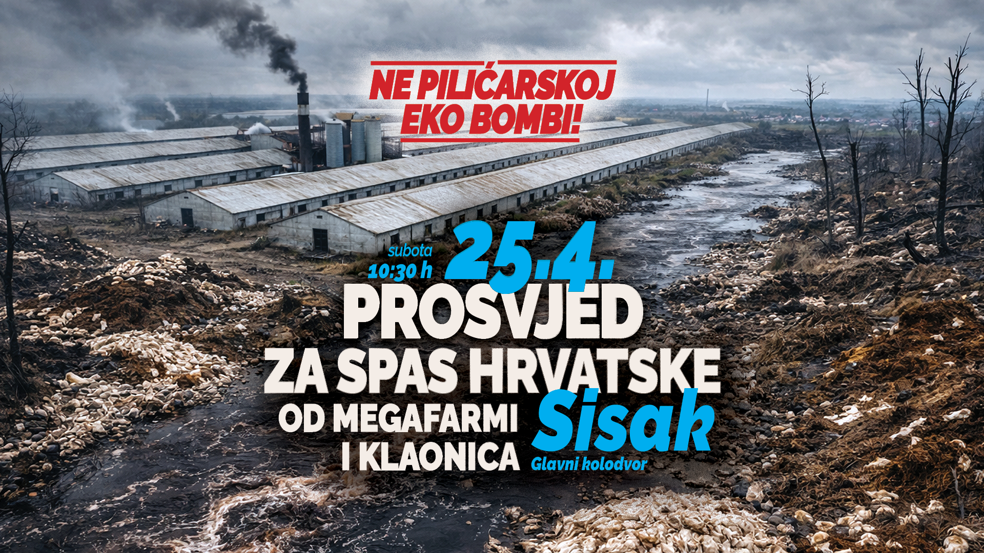 Novi prosvjed za spas Hrvatske od megafarmi i klaonica najavljen je za 25. travnja 2026. u Sisku, s okupljanjem u 10:30 sati na Glavnom kolodvoru. Organizatori pozivaju sve građane da se pridruže i zaštite Hrvatsku od modela koji bi “najprije uništio našu prirodu, gospodarstvo i zdrav okoliš, a potom otvorio vrata investicijama koje žrtvuju građane zbog profita”. Poručuju da razaranje naših zajednica, života i budućnosti ne smije proći.