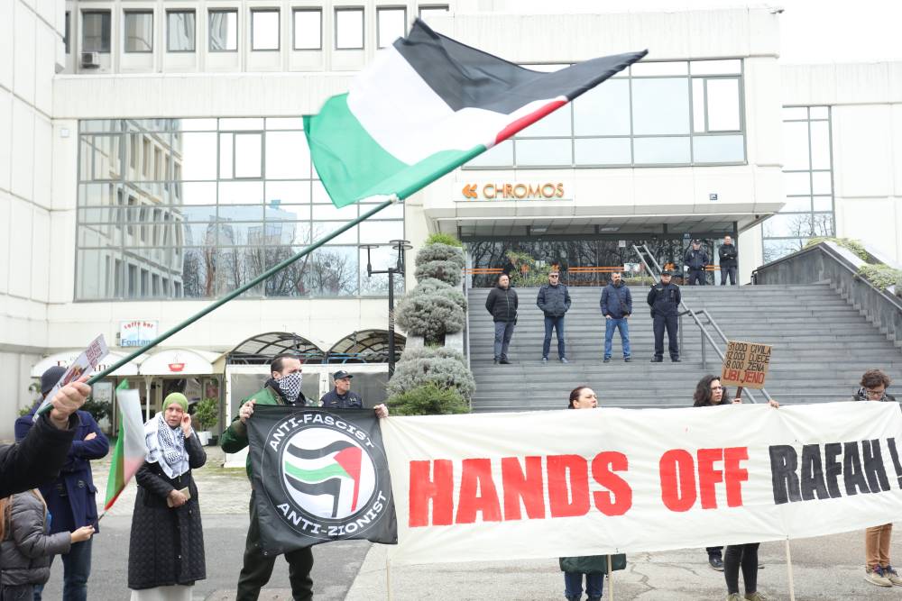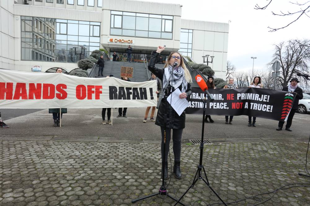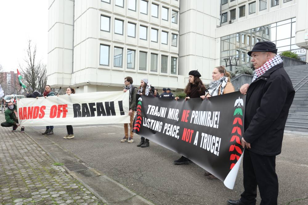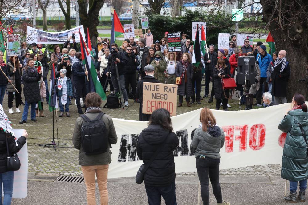Danas se ispred izraelske ambasade u Zagrebu okupilo dvjesto građana i građanki koji su od izraelske vlade tražili obustavu planiranja kopnenog napada na grad Rafah, jedino utočište za izbjegle i prognane Palestince i Palestinke, kao hitan i trajan prekid vatre u cijelom Pojasu Gaze.