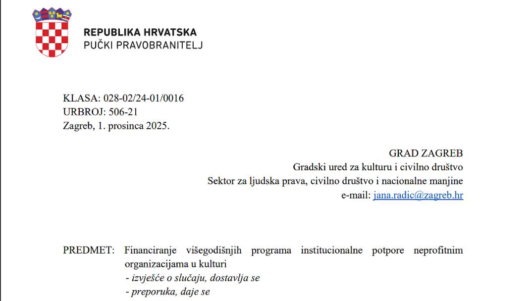 Tek 8. svibnja 2025., dakle deset mjeseci nakon zaprimanja zahtjeva za „očitovanjem“, Grad se udostojao očitovati. U bitnome, odgovorio je pučkoj pravobraniteljici da iznos prihoda smatraju „jednim od indikatora postojanja kapaciteta koji imaju potencijal razvoja“, dodajući da je utvrđivanje sličnih kriterija uobičajena praksa i drugih javnih davatelja potpora za kulturu i civilno društvo u Hrvatskoj.
